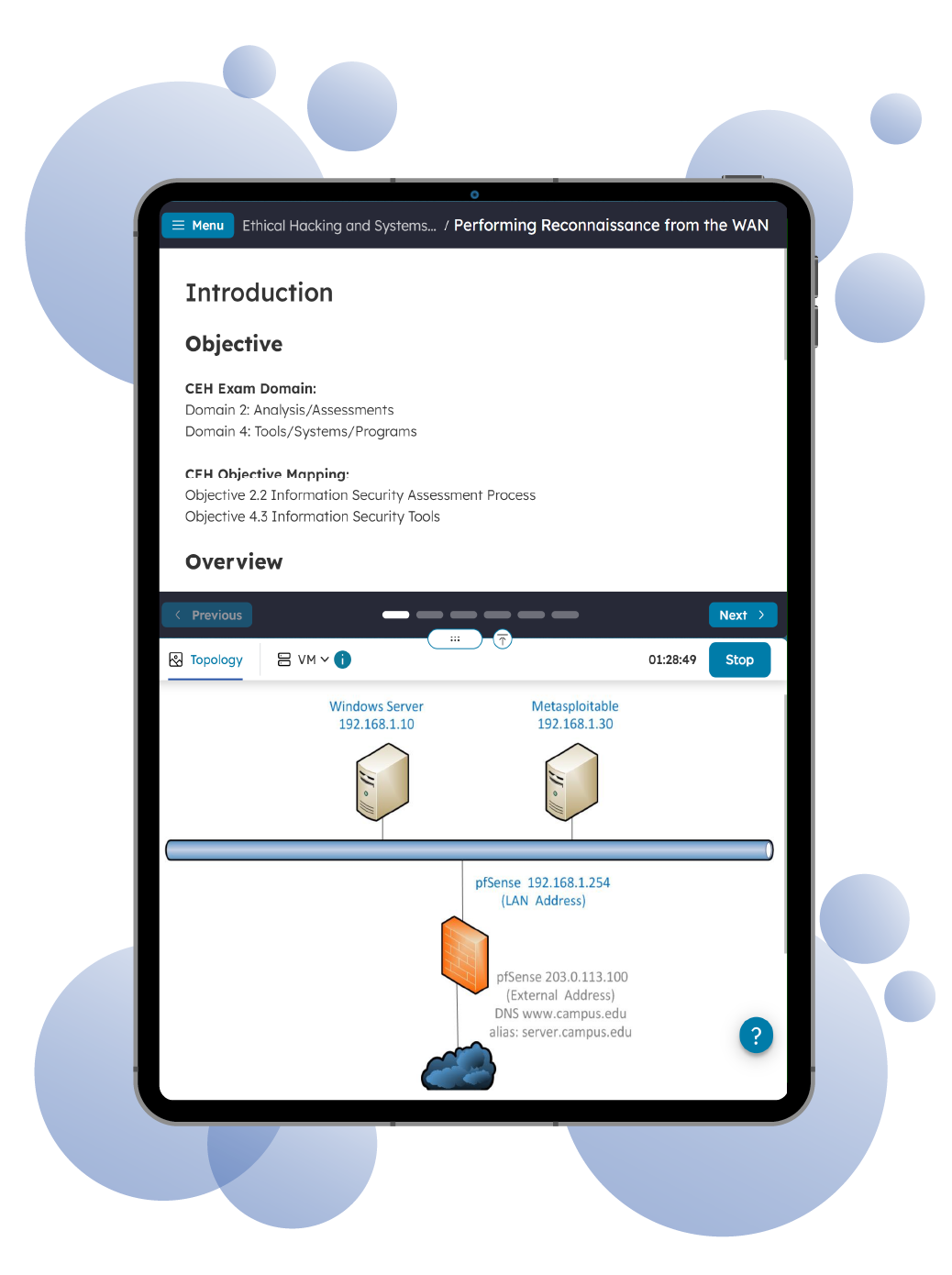 With step-by-step instructions and access to a preconfigured virtual network, you’ll perform tasks to improve your practical skills in Footprinting & Reconnaissance, Scanning Networks, Device & Device Enumeration, Social Engineering, System Hacking Concepts and Port & Process Monitoring. The lab environment eliminates the need to build or manage your own infrastructure, allowing you to focus entirely on skill development.